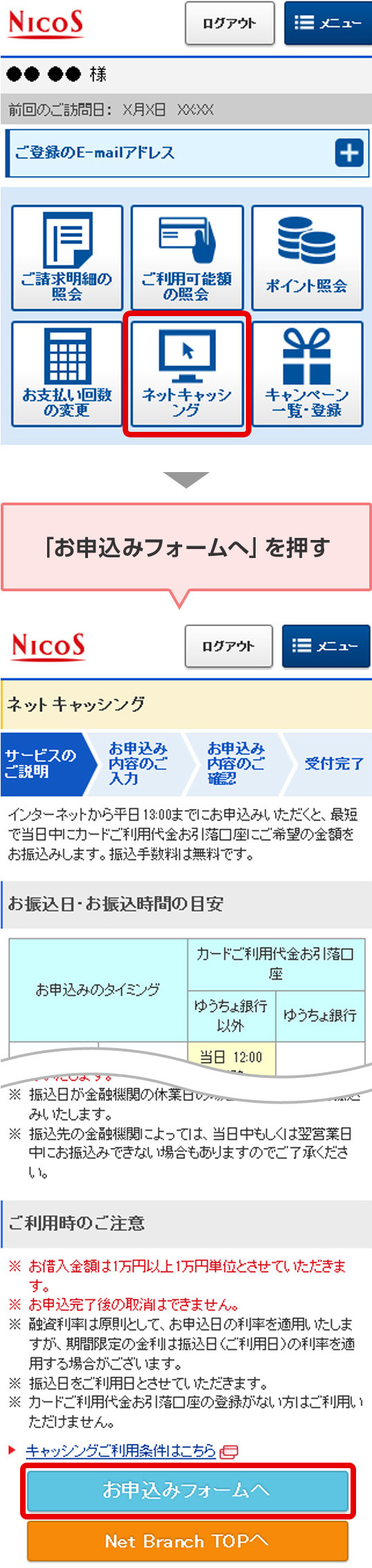 Web会員サービス「Net Branch」にログイン後、「ネットキャッシング」をお申し込みいただけます。