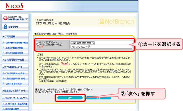 ①「お届け内容の変更」を押す ②「ETC PLUSカード入会お申込み」を押す