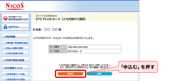 WEBサービスにログイン後、「ETCカード」のお申し込み手続きができます。
