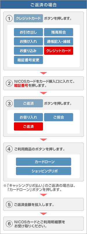 - ご請求確定後(14日)から当月ご請求金のお引落日前日までにATMからご返済いただいた場合、当月のカードご利用代金請求書には反映されません。また、返済内容によっては、当月ご請求金に充当し、差額を当月ご請求金をお引き落とし後に返金させていただく場合や、翌月以降のご請求金に充当をする場合等がございますので、あらかじめご了承ください。