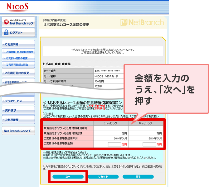 STEP 6. 「リボお支払いコース金額の任意増額(臨時加算)」に金額を入力のうえ「次へ」を押す