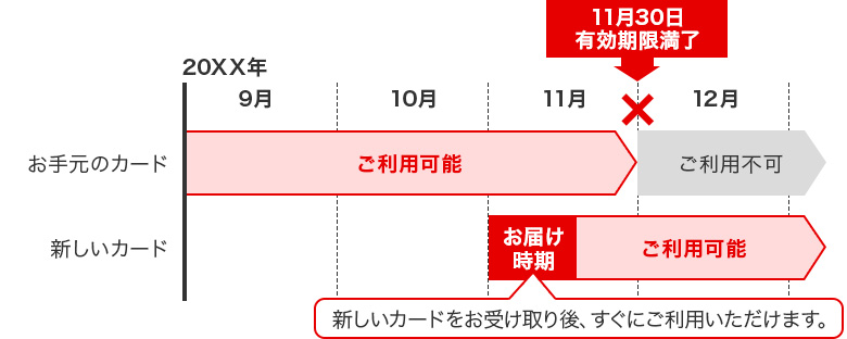 有効期限が更新された新しいカードは、有効期限当月の上旬から中旬にかけて順次お送りいたします。