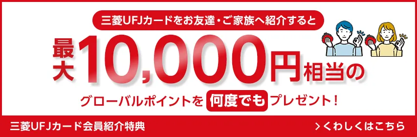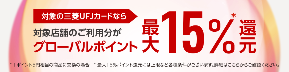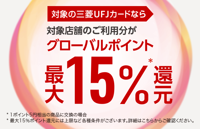 最大20%グローバルポイント還元※最大20%ポイント還元は、カードのお支払口座を三菱UFJ銀行の口座に設定いただき、MDCアプリからエントリーいただく必要がございます。