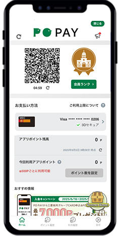 ホーム画面の「ポイント数を設定」をタップし、利用ポイント数を500P単位で決定し、「設定する」をタップしてください。 - ③店舗スタッフ:店舗端末にて、お客さまのQRコードを読み取りし、決済が完了すると決済音が流れます。